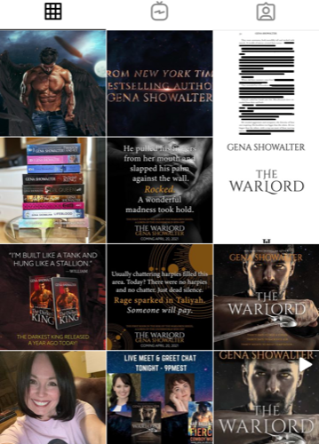 In contrast, the sample from Gena Showalter doesn't look nearly as visually appealing here. However, my personal opinion is that Gena is a brilliant marketer. Or, whomever is doing her marketing is. What I notice about Gena's posts is that they largely feature dark colours -- which makes sense given her series is Lords of the Underworld. Taken as a unit like in this collage, that is not fully appealing. On an individual basis, Gena's posts pop. They are visually identifiable as hers, they stick to character (so to speak), they are creative, sexy, and the text is always easy to read. The quotes she uses really captures the nature of the characters and stories. As well, Gena tends to utilize Instagram stories regularly and with a lot of success. She also has interesting merchandise ideas. Occasionally Gena throws in a photo of herself on her feed, but only in context of the books. She even photoshopped herself into one of her covers. Her posts are fun and immediately identifiable. In other words, when it comes to Instagram, Be Like Gena. The only problem I see for beginning authors is that her marketing strikes me as being fairly expensive. She appears to use actual models to create her characters, and that is simply beyond the beginner's budget. Defs beyond my personal budget.